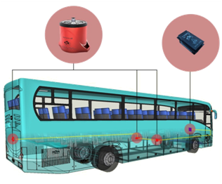 计案例:江西百路佳新能源6.5米长客车,内有电池舱5个,故需设计的保护区为5个保护区,每个保护区配置1台自动灭火装置(型号QRR0.03GW/SHS-AR23ZF),5个保护区内的5台装置通过总承线束和驾驶员操作盘上的模块联接。